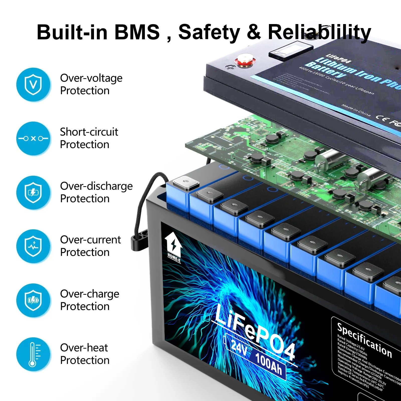 -Built-in BMS: Integrated Battery Management System (BMS) ensures the safe operation of the battery, preventing overcharging, over-discharging, short-circuiting and over-temperature.